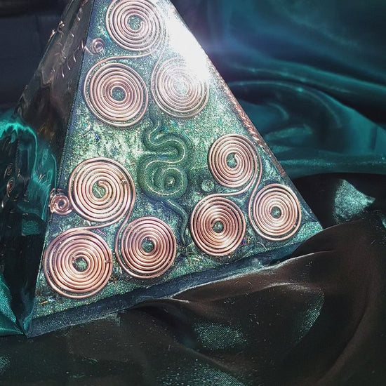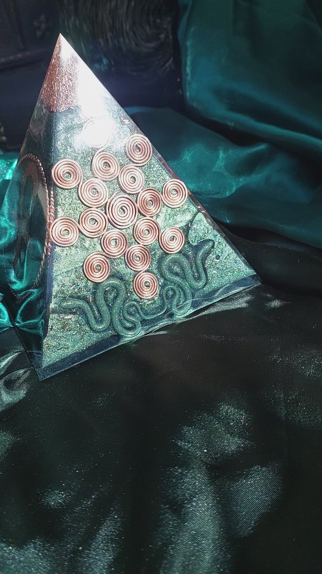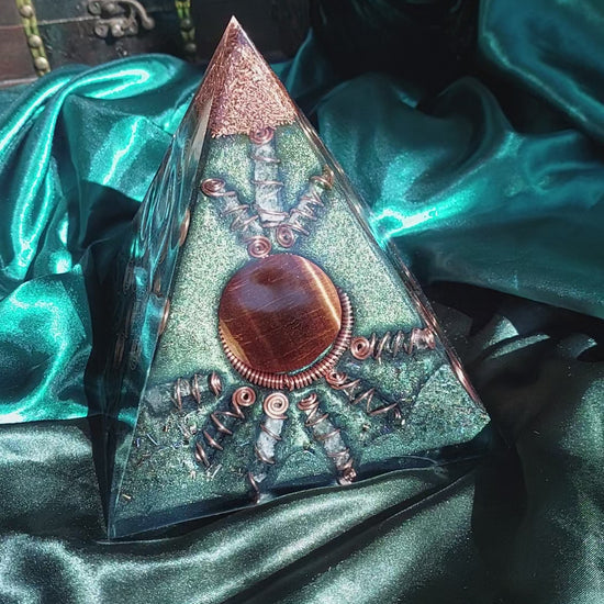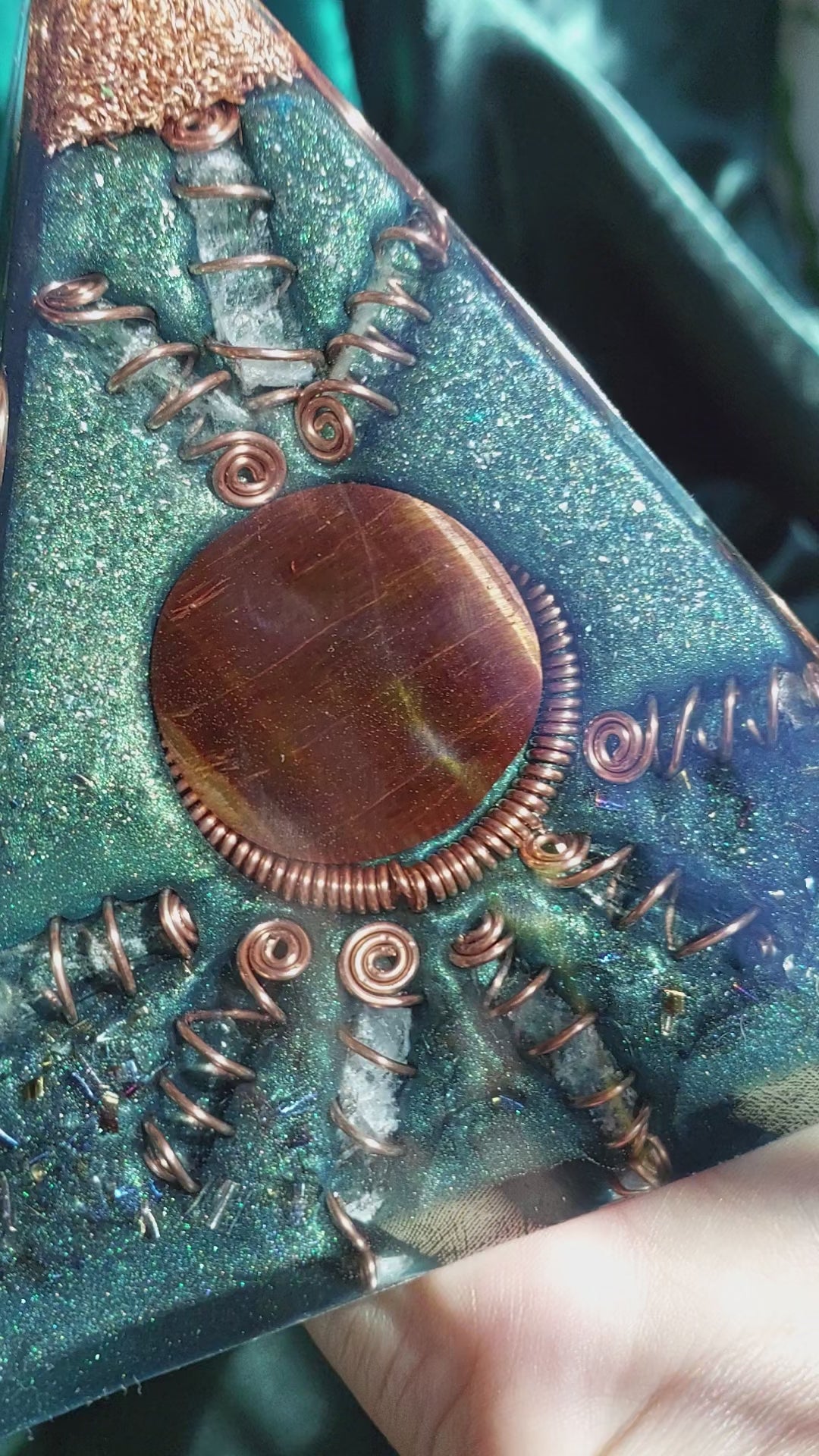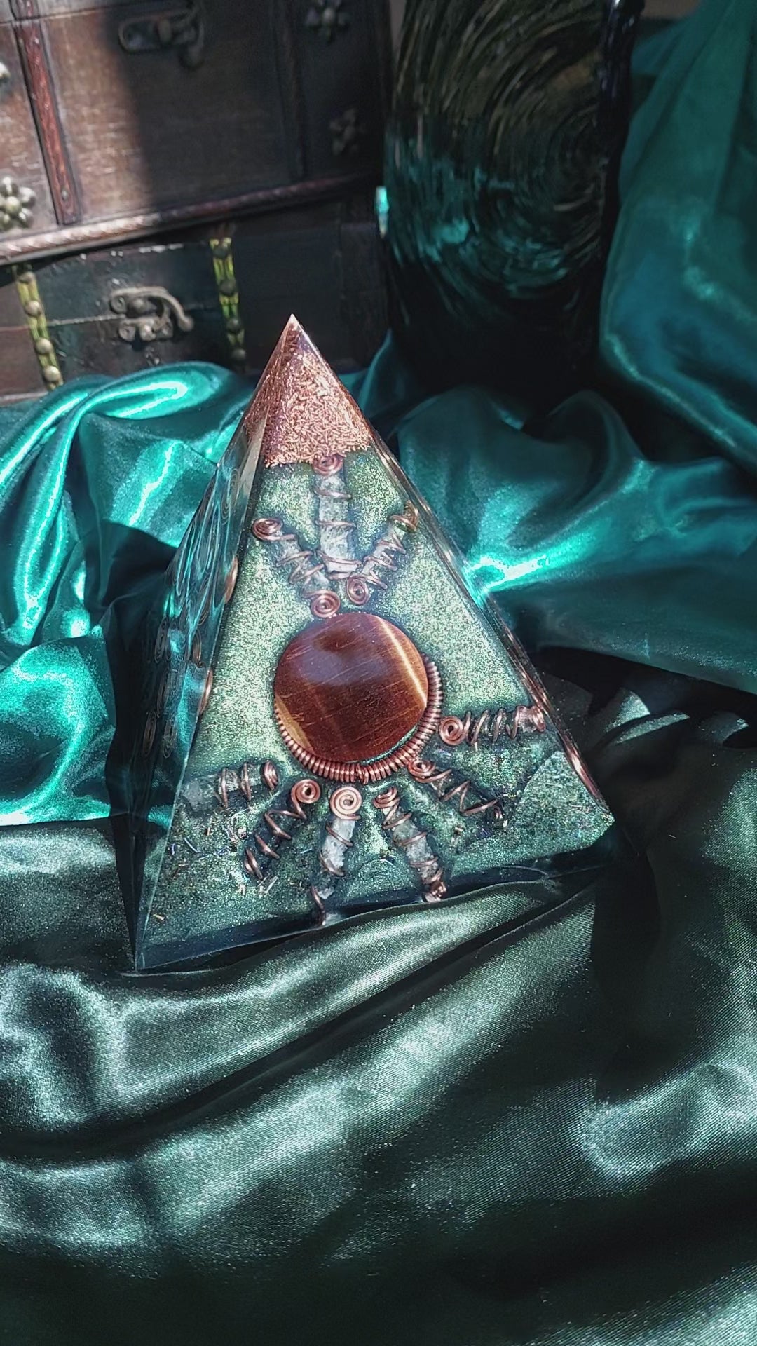 A complex, high-vibe orgonite pyramid requiring weeks of craftsmanship. Each side showcases unique symbolic and energetic details, designed to reharmonise energy, support chakra alignment, and amplify protective and healing frequencies. The rich deep green resin layers contrast beautifully with copper accents and red tiger eye flatsone.