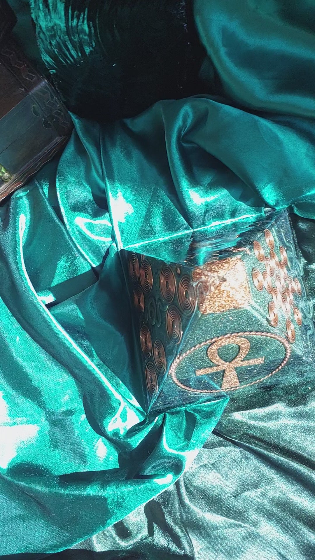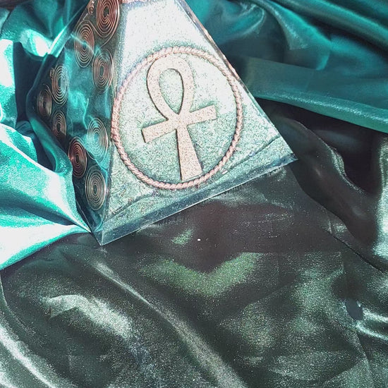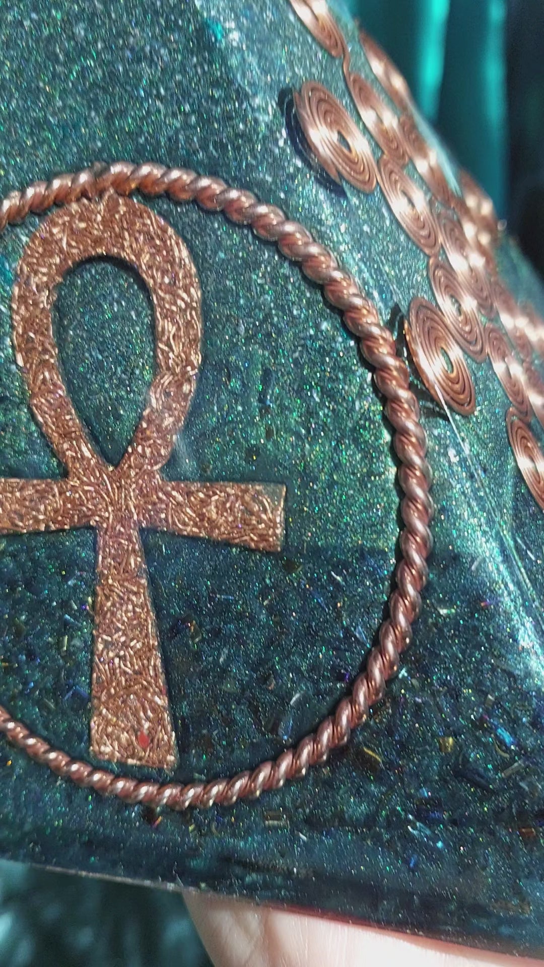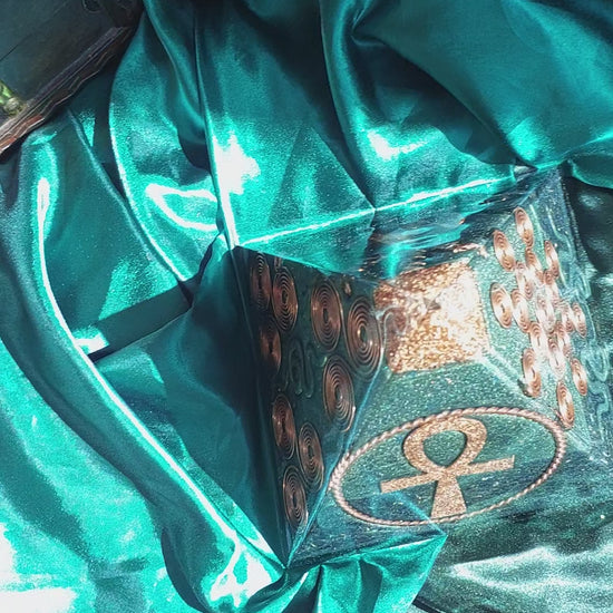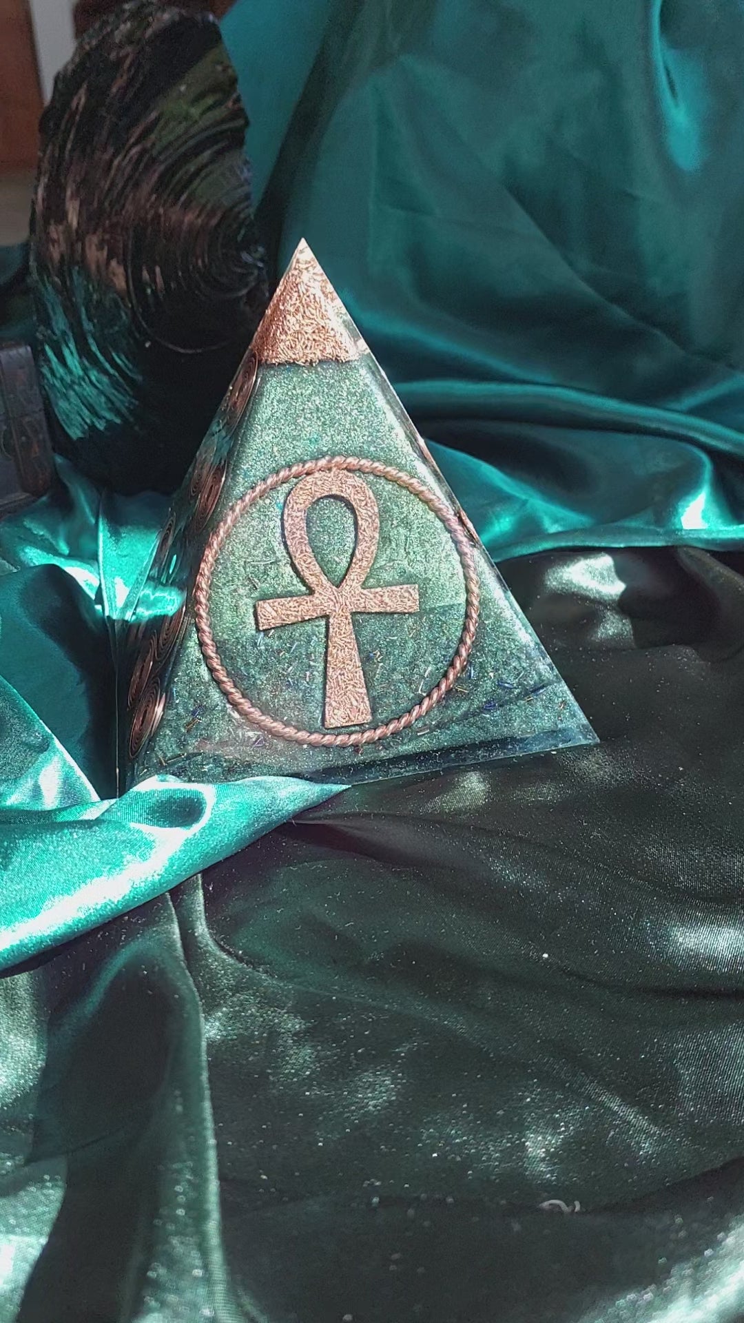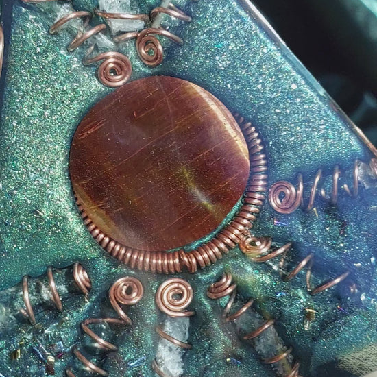 A complex, high-vibe orgonite pyramid requiring weeks of craftsmanship. Each side showcases unique symbolic and energetic details, designed to reharmonise energy, support chakra alignment, and amplify protective and healing frequencies. The rich deep green resin layers contrast beautifully with copper accents and red tiger eye flatsone.