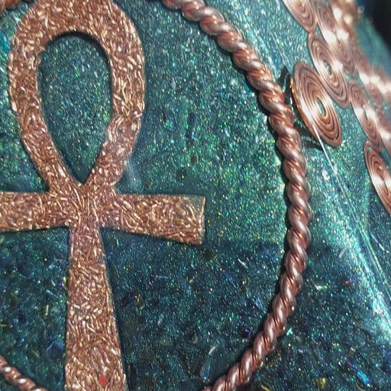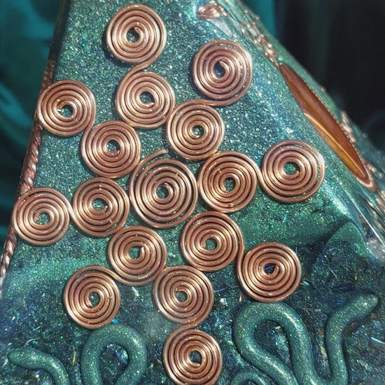 Enhances transformation, protection, and energetic flow via sacred geometry, triskels, coils, and symbolic copper elements.