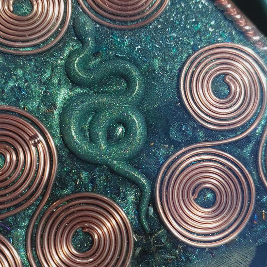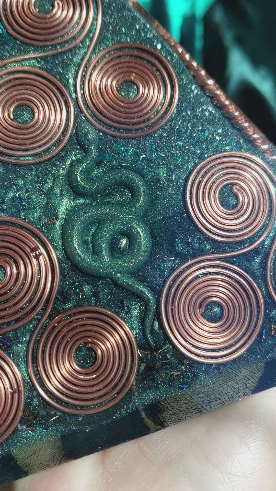 Side 2 — Green Resin Snake + 3 Copper Triskels: Enhances transformation, intuition, and healing energy, with triskels amplifying flow in sets of 3, 6, 9.