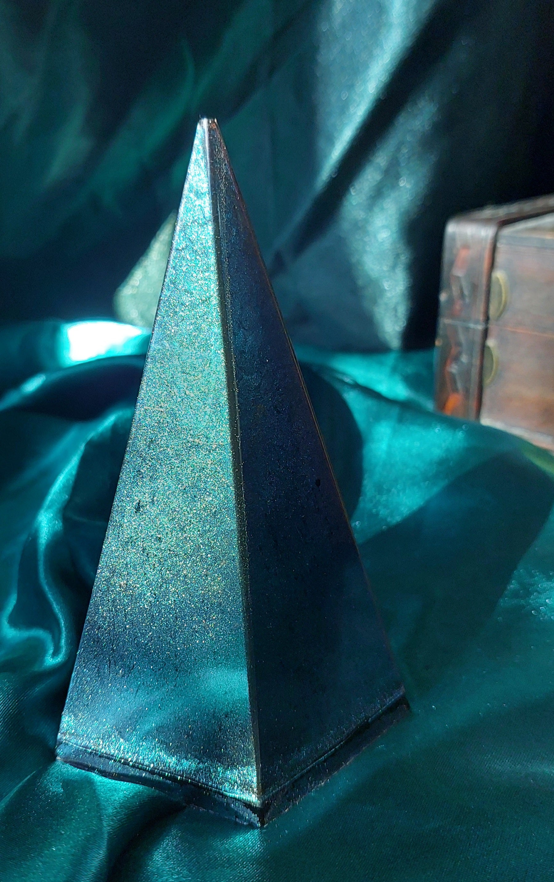 A powerful orgonite pyramid designed to reharmonise the energetic field, deeply ground your space, and support EMF field coherence.