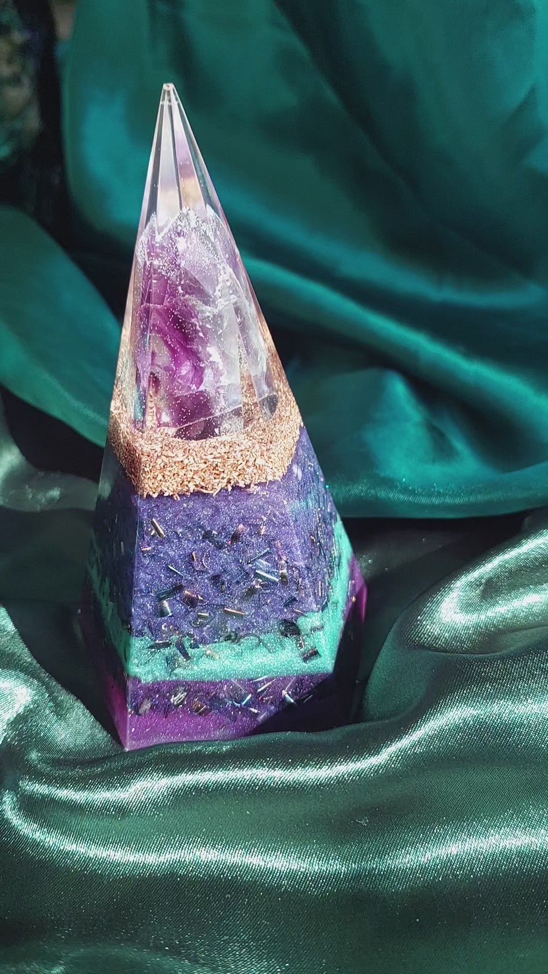 A collection of pentagonal orgonite pyramids, each featuring a unique fluorite point. Every point displays its own natural pattern of purples and greens, making each pyramid one-of-a-kind. Designed to reharmonise energy, ground your space, and support clarity and coherence.