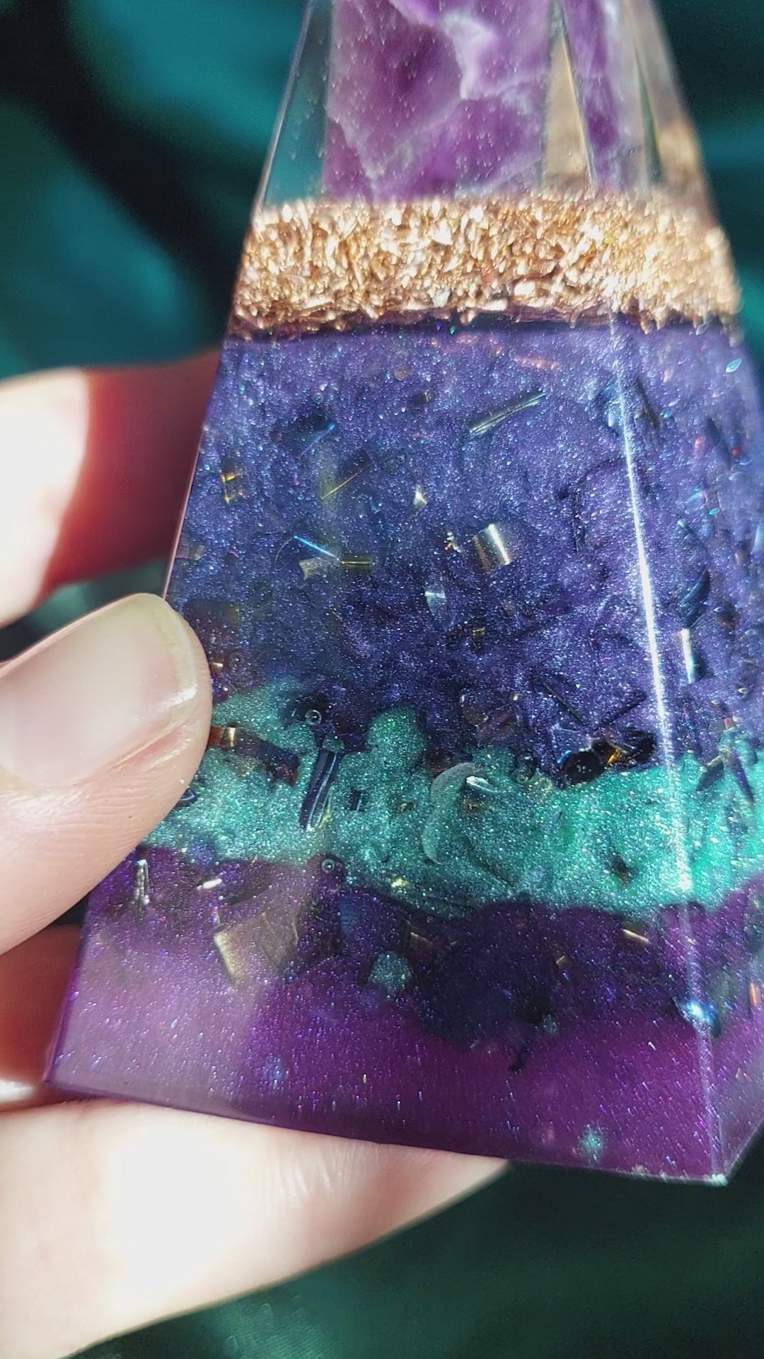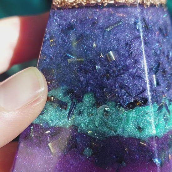Colored Quartz + Recycled Metal Layers: Purple and green layers match the unique fluorite point; quartz chips drive piezoelectric activation, while recycled metal swarf attracts non-coherent energy fields (including EMFs) and allows the matrix to reorganise energy back into coherence.